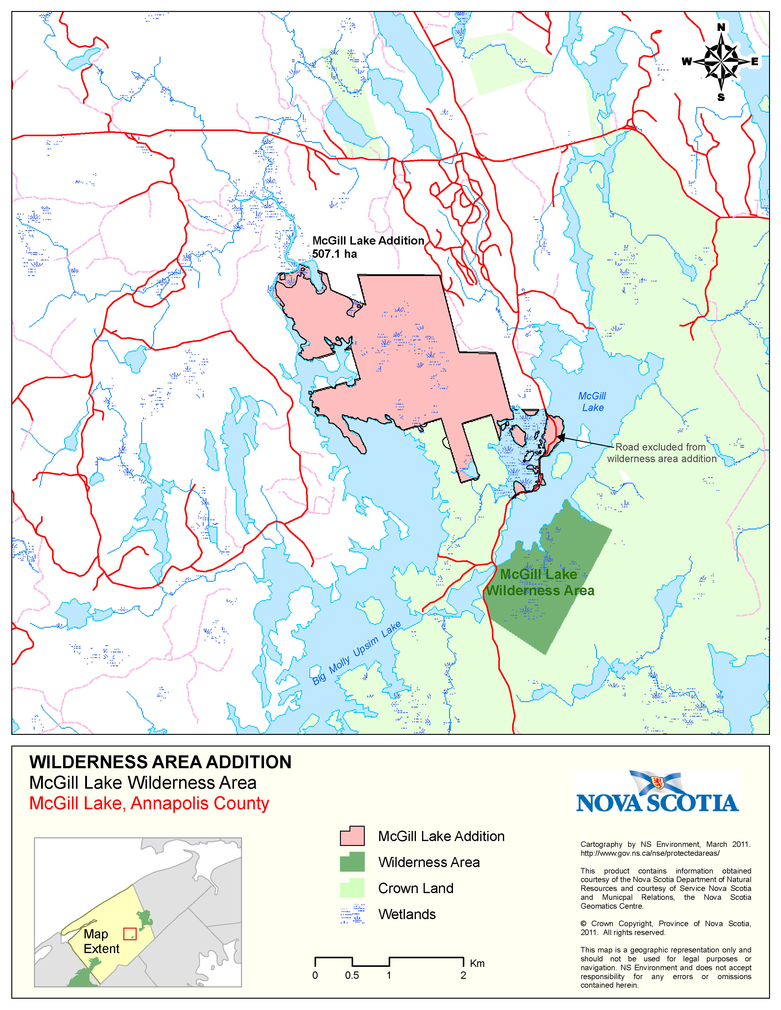I, Sterling Belliveau, Minister of Environment for the Province of Nova Scotia, pursuant to clause 11(3)(b) of Chapter 27 of the Acts of 1998, the Wilderness Areas Protection Act, hereby designate areas of Crown land at McGill Lake, Annapolis County, with approximate boundaries as shown on the map attached as Appendix A, as additions to McGill Lake Wilderness Area, originally designated in item 15 of Schedule A to the Act.