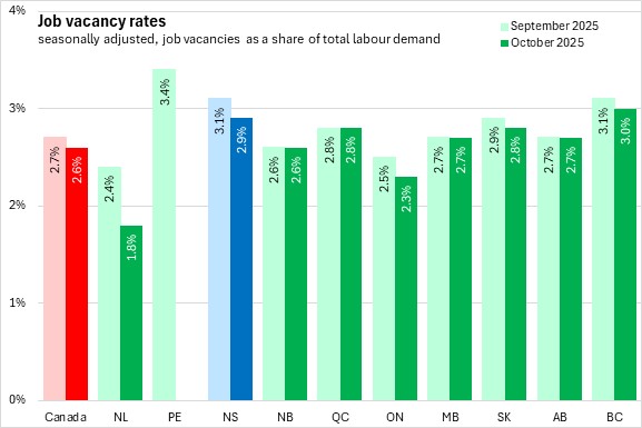 Nova Scotia had 13,450 job vacancies in October 2025 with a vacancy rate of 2.9% (second highest among provinces after British Columbia), down 0.2 percentage points from the previous month.