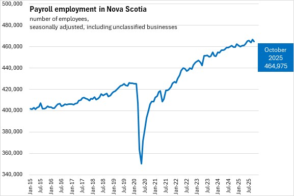 Nova Scotia had 464,975 payroll employees in October 2025, down 0.39% (-1,812) compared to September 2025, the second fastest decline among provinces. Canada had 18.29 million employees, up 0.12% from September 2025 with gains in five provinces. The fastest gain was reported in Saska...