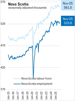 Nova Scotia's seasonally adjusted employment grew 2,600 (+0.5%) to 523,600 in November, following a decline of 4,400 (-0.8%) in the previous month.