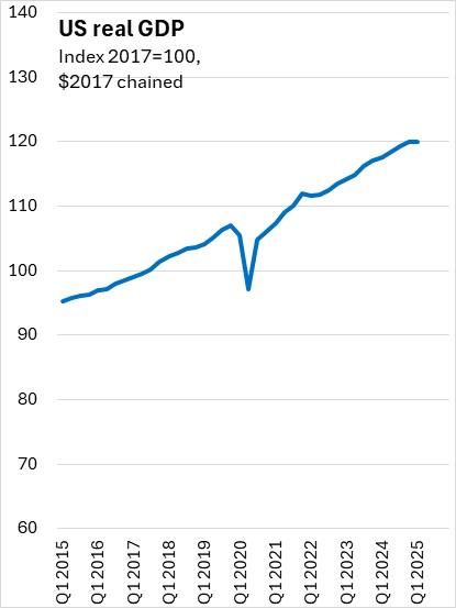US real GDP growth was estimated at -0.3% (seasonally adjusted annualized rate) for Q1 2025 in the advanced estimate. This was the first quarterly contraction since Q1 2022.