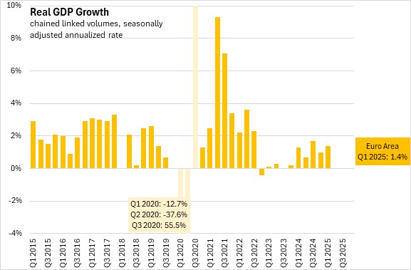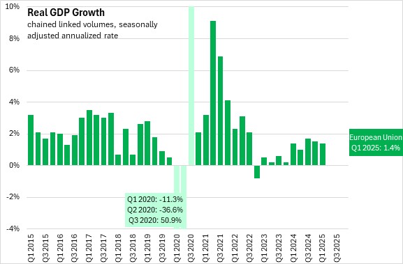 In the preliminary flash GDP estimate for Q1 2025, the seasonally adjusted annualized growth rate for real GDP was +1.4% for the European Union and +1.4% for the Euro Area (a subset of 20 of the 27 nations of the European Union).