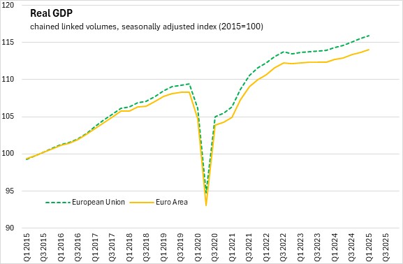 The European Union economy was 1.4% larger compared to the first quarter of 2024. The Euro Area economy was 1.2% larger in Q1 2025 than in Q1 2024.