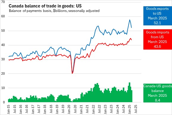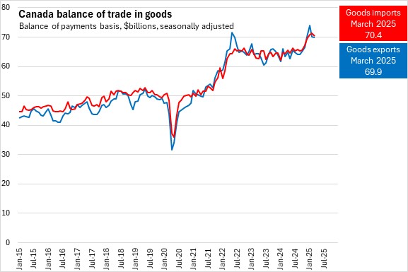 Exports declined in six of eleven product sections, led by exports of consumer goods. Statistics Canada notes that the decrease in total exports in March also coincided with the implementation of the new US tariffs on Canadian goods. Goods exports decreased to the United States but were almost entirely offset by an increase in exports to other countries.