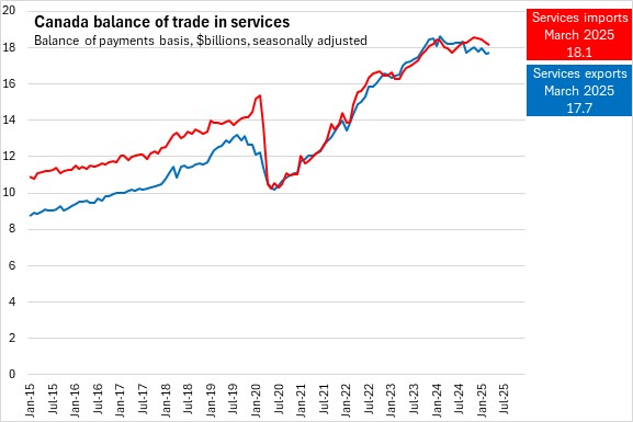 Canada's international exports of services increased 0.3% from the previous month to $17.7 billion in March 2025. Canada's imports of services decreased by 0.9% to $18.1 billion. Canada's deficit in international service trade narrowed by $207 million to $436 million.