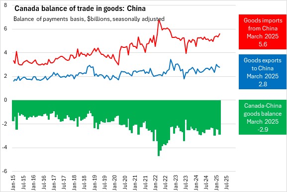 Canada's exports of goods to China declined 3.6% to $2.8 billion in March 2025. Canada's imports of goods from China rose 5.7% to $5.6 billion. Canada's deficit in goods trade with China widened by $409 million to $2.9 billion.