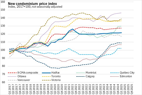 May 06, 2025NEW CONDOMINIUM APARTMENT PRICE INDEX, Q1 2025 Statistics Canada's New Condominium Apartment Price Index reports prices for condominiums in apartment-style structures for 9 Census Metropolitan Areas (CMAs): Halifax, Montréal, Québec City, Ottawa (Ontario part), Toronto, Calgary, Edmonton, Vancouver and Victoria.