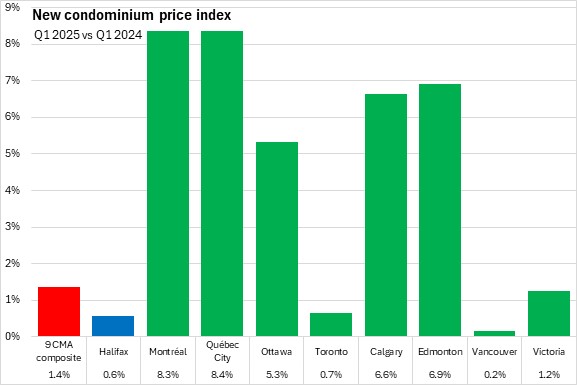 Compared with Q1 2024, Halifax's new condominium prices were up 0.6%. Condo prices rose 1.4% in the 9-city composite index with the largest gains in Montréal and Québec City. All 9 cities reported higher prices for new condos with the slowest growth in Vancouver (followed by Halifax and Toronto).