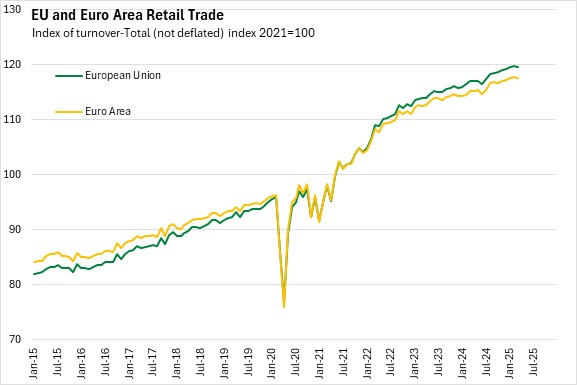 In the European Union, on a year-over-year basis, retail sales were up 2.2%. In the Euro Area, retail sales were up 2.0% in March 2025.