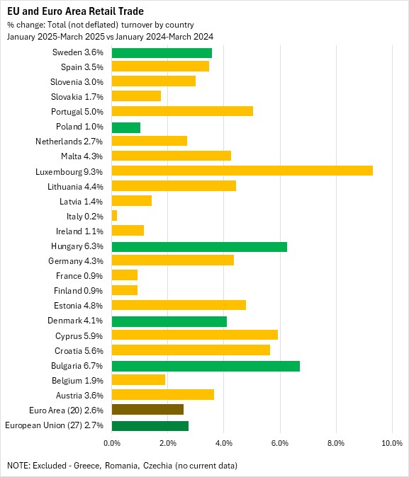 By member state, where data is available, the strongest growth in year-to-date retail sales occurred in Luxembourg, Bulgaria, and Hungary. Italy reported the slowest growth in retail sales in the first three months of 2025.