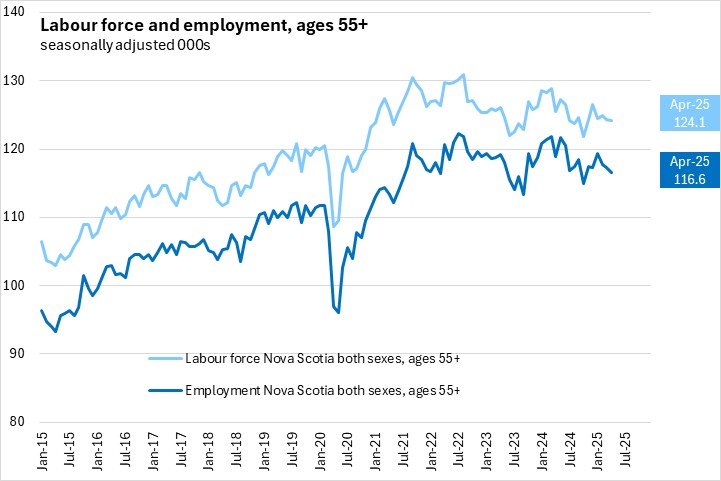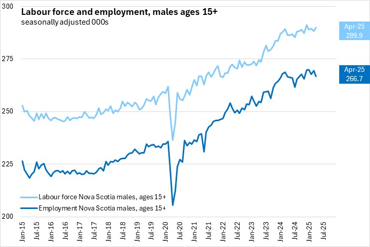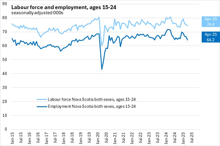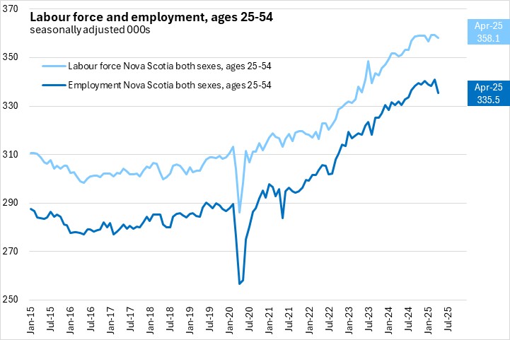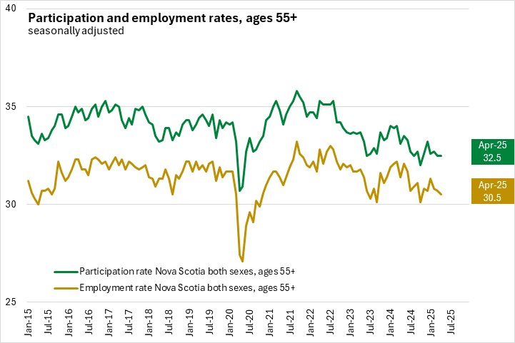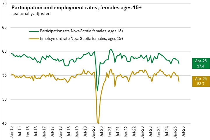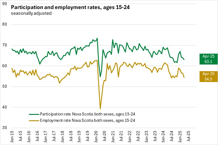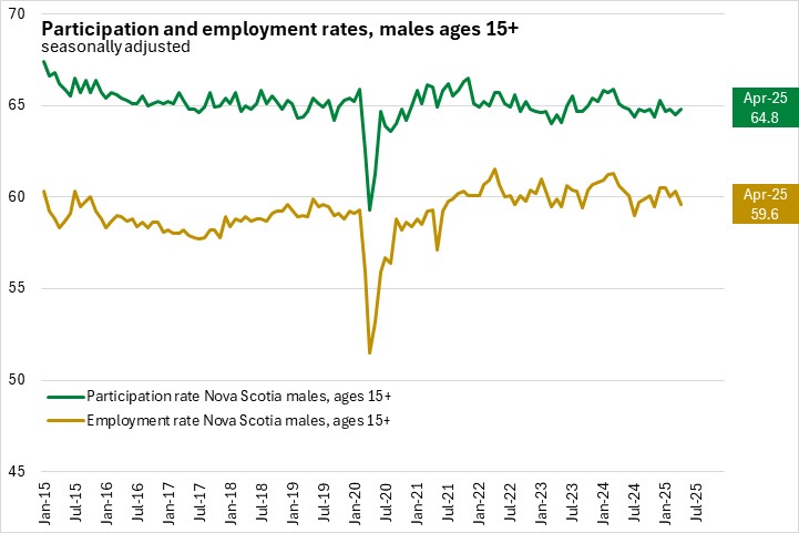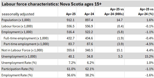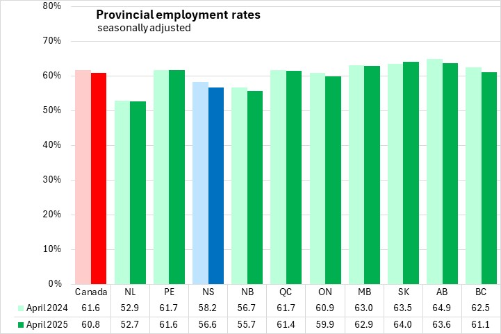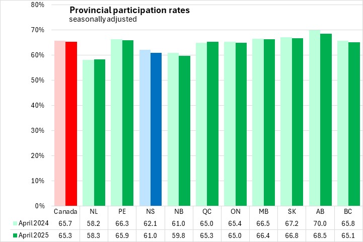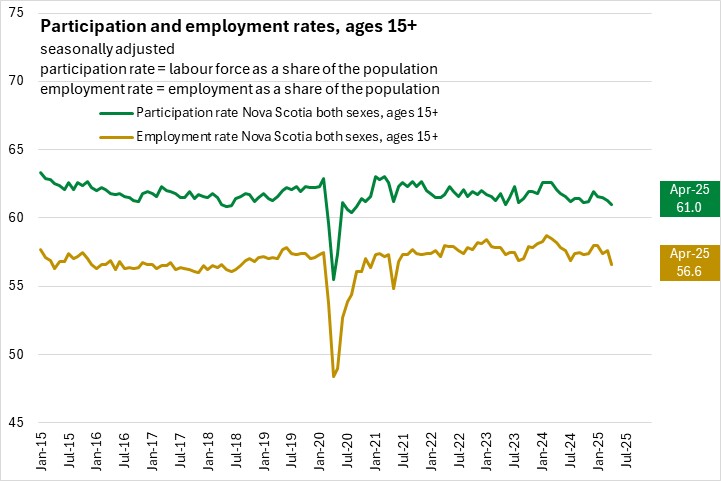 Nova Scotia's labour force participation rate was down 0.3 percentage points to 61.0% and the employment rate was down 1.0 percentage points to 56.6% in April 2025.