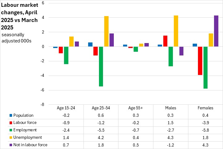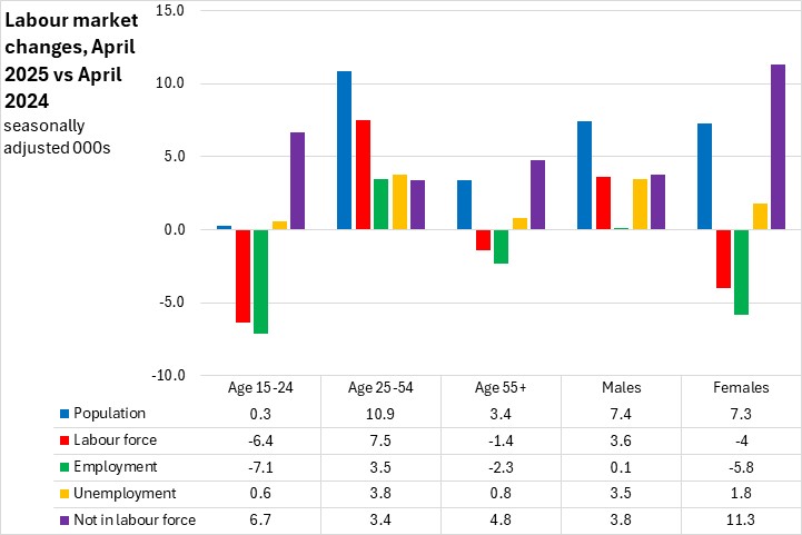 Age and sex cohorts (April 2025 vs April 2024, seasonally adjusted)