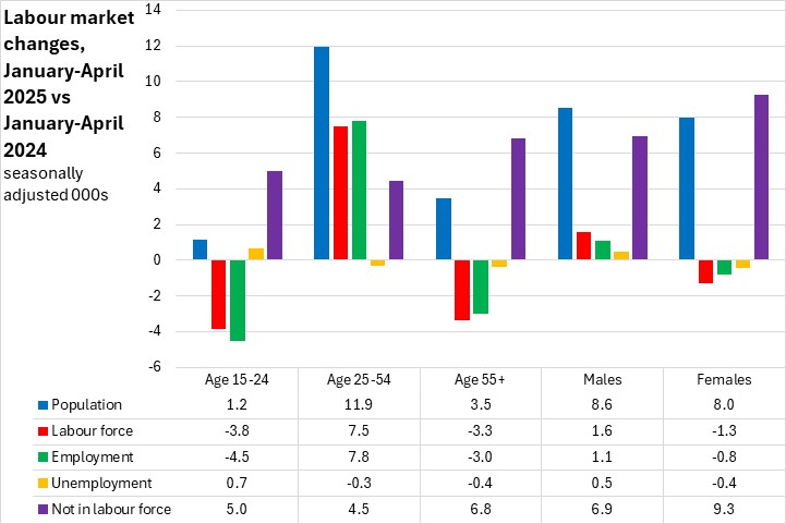 Ages 15+ (January-April 2025 vs January-April 2024, seasonally adjusted)