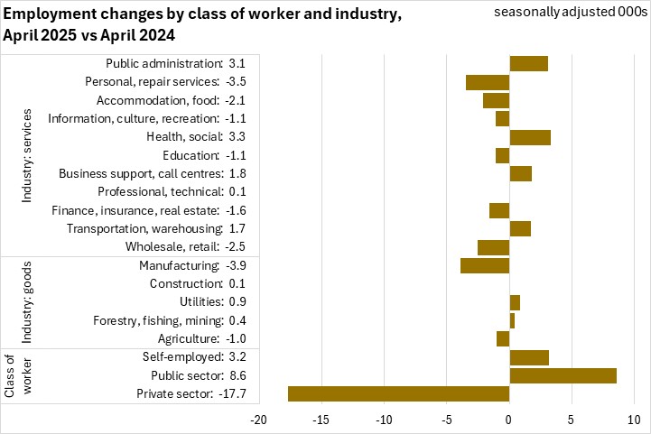 Compared to April 2024, there were employment losses for private sector workers (-17,700 or -5.3%), with gains for public sector workers (+8,600 or +6.4%) and the self-employed (+3,200 or +6.1%).