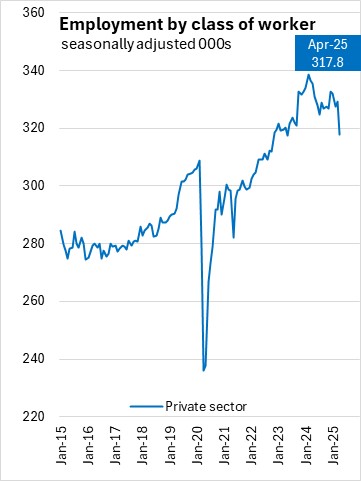 The April 2025 employment decline was due to decreasing private sector (-11,400, -3.5%) workers. Self employment increased by 2,700 (+5.1%) in April, while public sector employment rose by 100 (+0.1%).