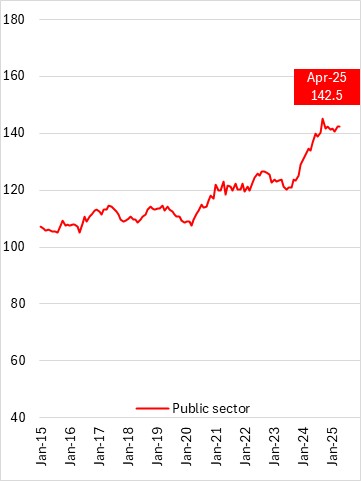 Compared to January-April 2024, gains were strongest for public sector workers (+8,800 or +6.6%), with smaller gains in self employment (+1,000 or +1.8%). There was a decline in private sector workers (-9,500 or -2.8%).
