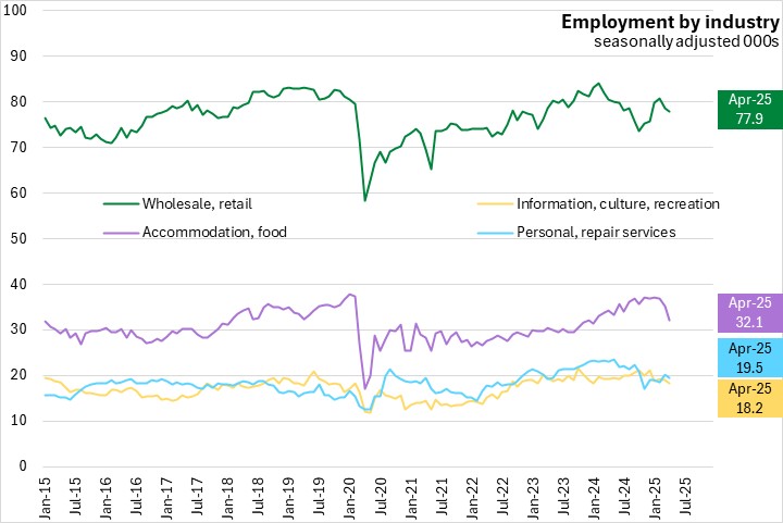Among youth (ages 15-24), employment was down 2,400 (-3.6%) while the labour force fell by 900 (-1.2%). As employment fell faster than the labour force, the youth unemployment rate increased 2.0 percentage points to 13.6% in April 2025. The youth participation rate fell 0.7 percentage points to 63.1% while the youth employment rate was down 1.9 percentage points to 54.5%.