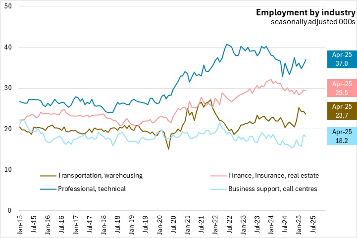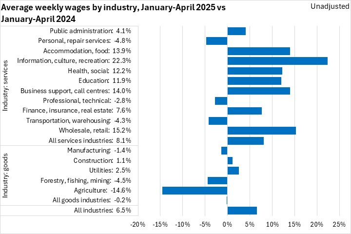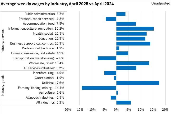 Average weekly earnings increased by 5.9% from April 2024 to April 2025. The fastest gains in average weekly earnings were in utilities, information/culture/recreation, and business support/call centers. The largest declines in average weekly wages were in forestry/fishing/mining.