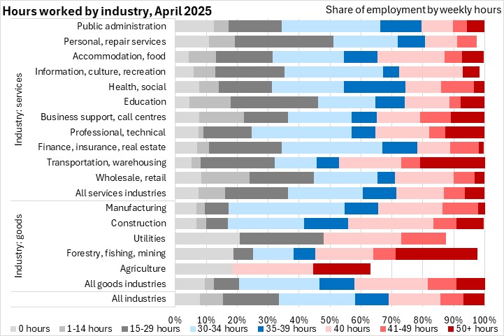 Compared to the provincial average, a larger share of workers in goods producing industries, as well as transportation/warehousing, professional/technical services, and business support/call centers worked more than 40 hours per week in April 2025.