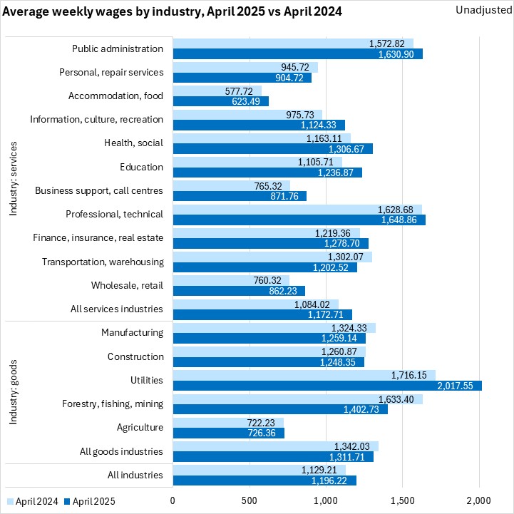 Average weekly earnings across all employees were $1,196.22 in April 2025. The highest average weekly earnings (both full and part time employees) were reported in utilities, public administration, and professional/technical services. The lowest average weekly earnings were in accommodation/food services and agriculture.