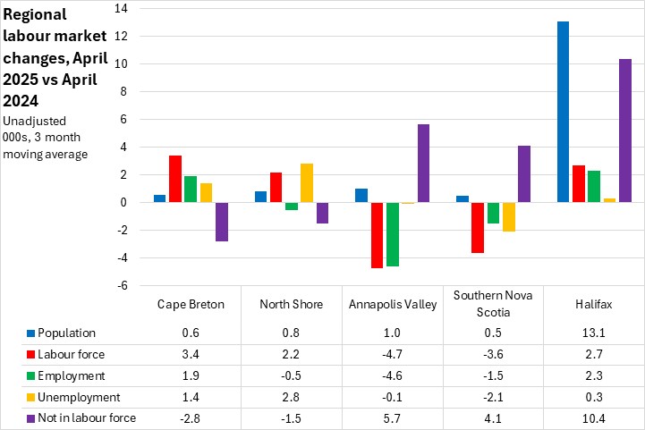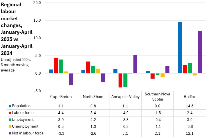 Compared with April 2024, labour force increases were concentrated in Cape Breton and Halifax, with smaller gains in North Shore. Halifax, North Shore and Cape Breton labour force growth outpaced employment growth, resulting in higher unemployment, with falling unemployment rates in all other regions. Annapolis Valley and Southern Nova Scotia reported falling labour force compared to one year ago. Halifax saw the strongest population growth, and a large increase in the number of people not in the labour force.