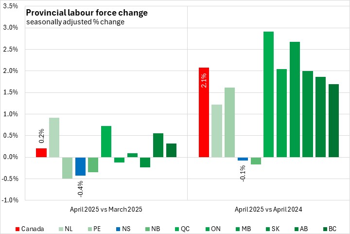 Canada's labour force was up 0.2% from March with five provinces reporting growth in April 2025. Newfoundland and Labrador reported the fastest growth while the largest decline was in Prince Edward Island.