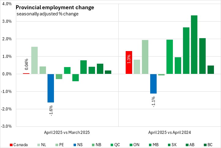 Canada's employment increased by 0.04% in April 2025. Seven provinces reported higher employment in April, led by Newfoundland and Labrador, while Nova Scotia reported the fastest decline. Compared with April 2024, the national gain was 1.3% with the fastest growth in Saskatchewan. The largest decline was in Nova Scotia.