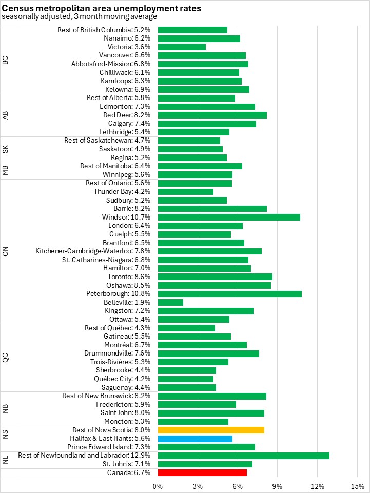 The Halifax unemployment rate was 5.6% in the seasonally adjusted April 2025 three month moving average. Outside of Halifax the unemployment rate was 8.0%. In central and western provinces, unemployment rates in Census Metropolitan Areas are similar to or higher than unemployment rates outside CMAs. In the Atlantic Provinces unemployment rates are typically higher outside CMAs.