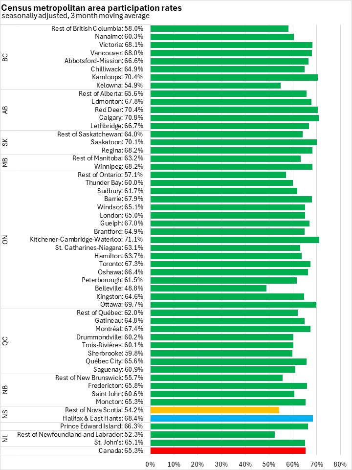 Halifax's participation rate was 68.4% in the seasonally adjusted April 2025 three month moving average, while participation rates were 54.2% across the rest of the province.