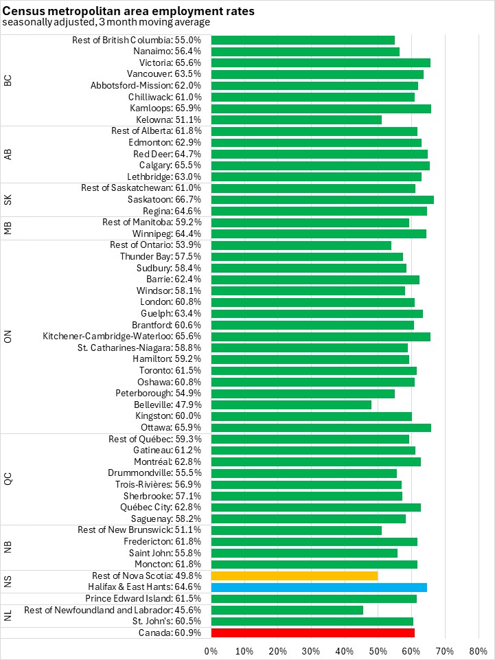 Halifax reported an employment rate of 64.6% in the seasonally adjusted April 2025 three month moving average, while the employment rate was 49.8% outside the city.