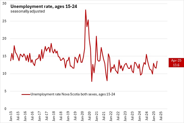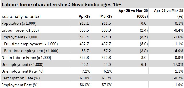 Compared with April 2024, Nova Scotia's population over the age of 15 increased by 14,700 (+1.6%), while the labour force declined by 400 (-0.1%), and employment declined by 5,800 (-1.1%). The unemployment rate increased by 1.0 percentage points while the participation rate fell by 1.1 percentage points and the employment rate fell by 1.6 percentage points.