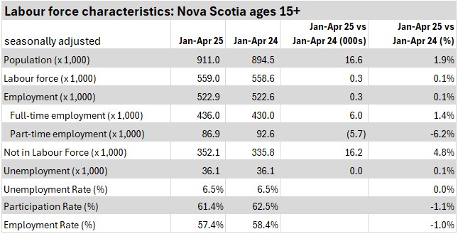 Compared with January-April 2024, Nova Scotia's population over the age of 15 increased by 16,600 (+1.9%), while the labour force grew by 300 (+0.1%), and employment increased by 300 (+0.1%). The unemployment rate was unchanged, while the participation rate fell by 1.1 percentage points and the employment rate fell by 1.0 percentage points.