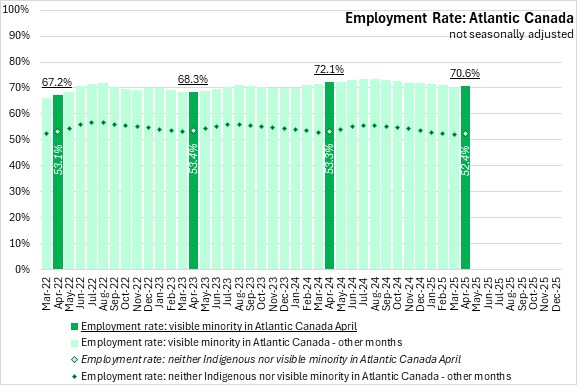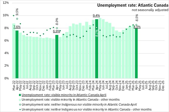 In April 2025, the unemployment rate for the visible minority population was lower than for the population that was neither Indigenous nor in a visible minority population in Atlantic Canada. This was the first month since May 2023 that the unemployment rate of visible minority population was less than the rate for those who identified as neither Indigenous nor in a visible minority population.