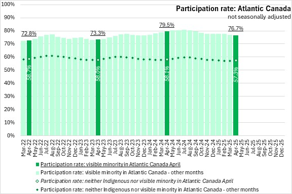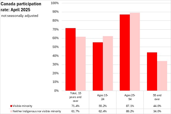 National participation rates were higher for those who identify with a visible minority population (71.4%) than for those that did not identify as Indigenous or in a visible minority population (61.7%). Participation rates of those who identify with a visible minority population were higher in all regions in April 2025. In Atlantic Canada, those who identify with a visible minority population reported an 76.7% participation rate, compared to a 57.3% participation rate for those that do not identify as Indigenous or in a visible minority population, the largest gap among regions.
