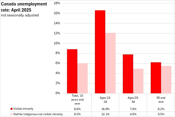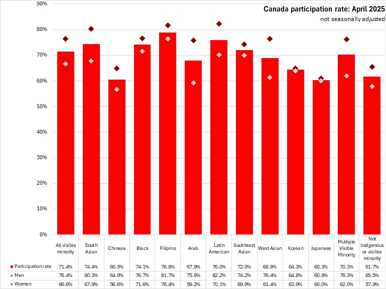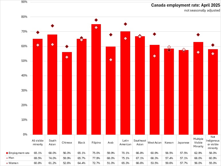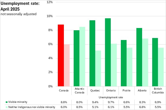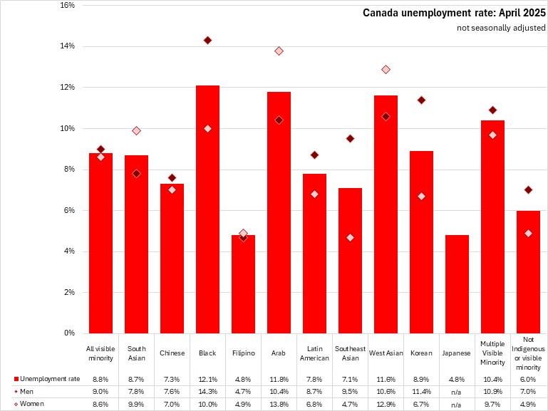 In April 2025, the unemployment rates of males in visible minority populations were higher (9.0%) than among females (8.6%) (which was also true of populations that did not identify as Indigenous or visible minorities). Unemployment rates of females were higher than for males among South Asian, Filipino, Arab, and West Asian populations.