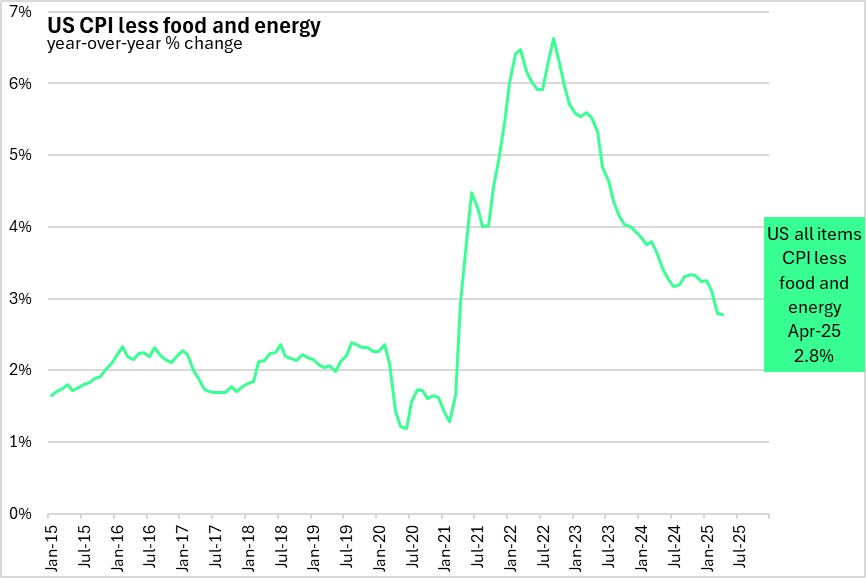 The US CPI excluding food and energy rose 2.8% compared to April 2024.