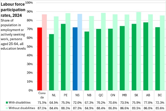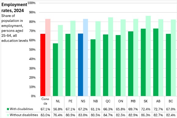 The employment rate for persons with disabilities (aged 25-64) in Nova Scotia was 67.2% in 2024 - about the same as the national average (67.1%), but 15.8 percentage points lower than the employment rate for Nova Scotians without disabilities (83.0%). Across Canada, the employment rate for persons with disabilities was highest in Alberta and Saskatchewan; the lowest employment rate for persons with disabilities was in Newfoundland and Labrador (which is consistent with a lower participation rate for persons with disabilities).