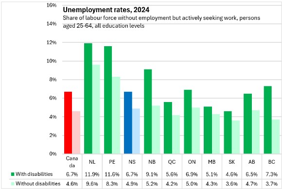 Unemployment rates for persons with disabilities were higher than for persons without disabilities in every province. In Nova Scotia, the 2024 unemployment rate for persons with disabilities was 6.7% - the same as the national unemployment rate for persons with disabilities. The lowest unemployment rate for persons with disabilities was reported in Saskatchewan (which also had the lowest unemployment rate for persons without disabilities). The highest unemployment rate for persons with disabilities was reported in Newfoundland and Labrador (where the unemployment rate for persons without disabilities was also highest among provinces).
