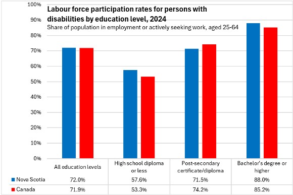 Nova Scotia's participation rate for persons with disabilities was higher than comparable national averages for those with high school and lower education levels as well as for those with a bachelor's degree or higher education. The participation rate for Nova Scotians with disabilities who had a post-secondary certificate or diploma was below the comparable national average.