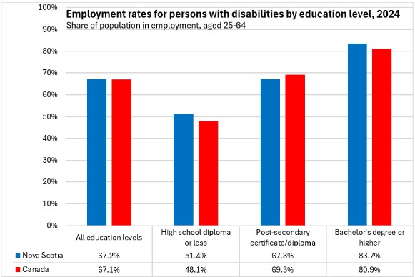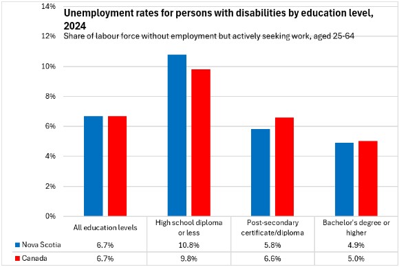 Nova Scotia's unemployment rates for persons with disabilities that had a high school or lower level of education were higher than for Canadians with disabilities that had similar education levels. Nova Scotians with disabilities that had post-secondary certificates/diplomas as well as those with university degrees reported lower unemployment rates than Canadians with disabilities that had similar levels of education.