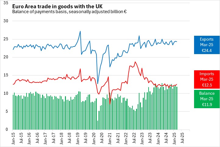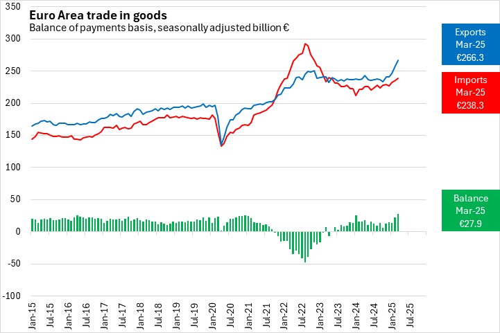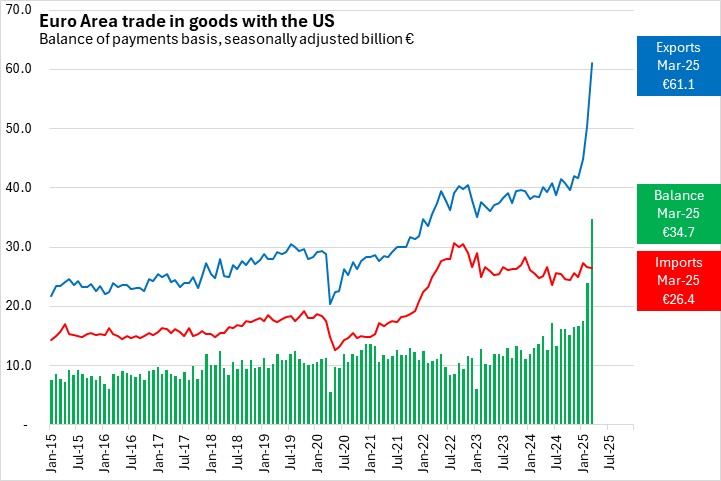 - the Euro Area surplus in goods trade with the US widened by €10.8 billion to €34.7 billion.