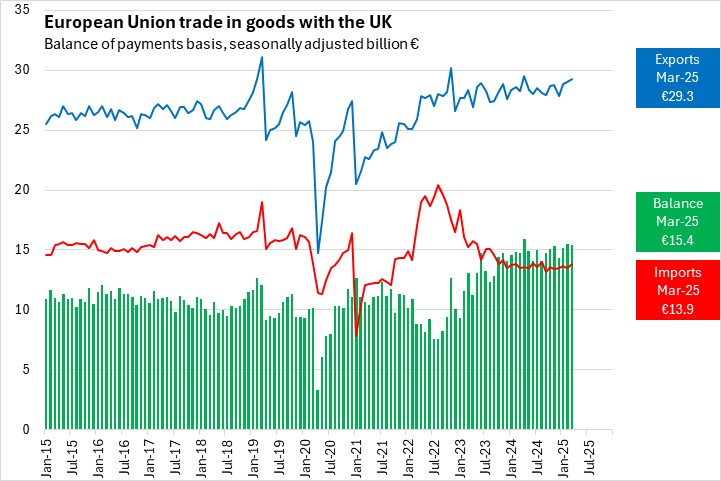 - the European Union surplus in goods trade with the UK narrowed by €64.4 million to €15.4 billion.