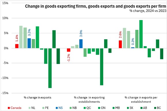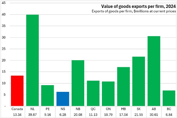 Across Canada, firms in Newfoundland and Labrador had the highest value of goods exports per firm. Nova Scotia reported the lowest value of goods exports per firm in 2024.