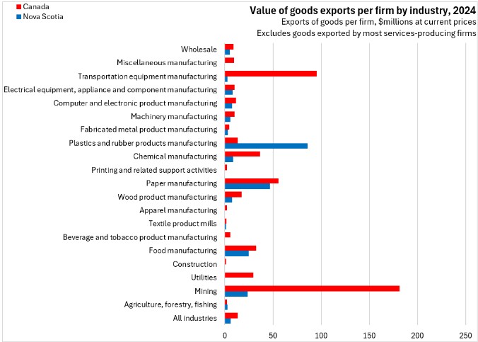 Looking at goods-producing industries as well as wholesale trade (excluding the small value of goods exports from other services-producing industries), Nova Scotia's value of exports per firm were typically lower than the comparable national averages. The exceptions were: plastics/rubber products and agriculture/forestry/fishing.