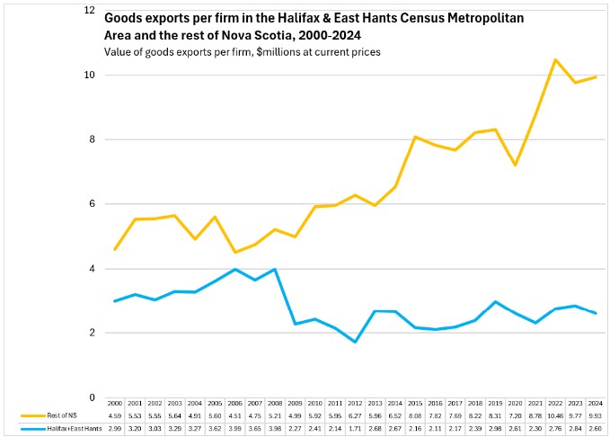 Although Halifax and East Hants accounted for half of goods exporters, the value of exports per firm was substantially higher for exporters outside the Census Metropolitan Area.