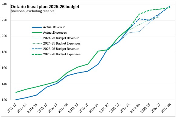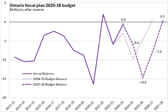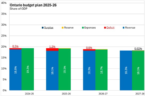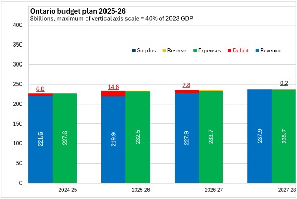 Ontario's 2025-26 budget anticipates a deficit of $14.6 billion, widening from the $6.0 billion deficit projected for 2024-25. In the next two fiscal years, Ontario expects its deficit to be eliminated, posting a small surplus of $0.2 billion in 2027-28 (after a reserve of $2 billion).
