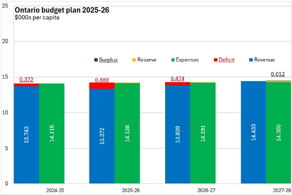 Ontario's 2025-26 Budget expenditures amount to $14,138 per capita (along with $122 per capita in reserve), funded by revenues of $13,372 per capita and a deficit of $888 per capita. Expenditures per capita are projected to rise by $161 by 2027-28 while per capita revenues rise $1,061.