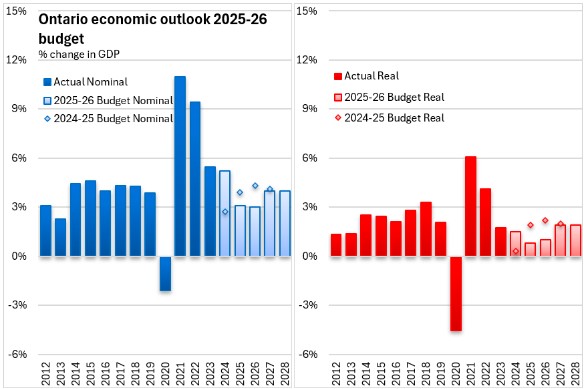 Despite stronger than expected performance in 2024, Ontario's budget economic outlook has softened considerably for 2025 and 2026 because of the threats of US tariffs. Ontario's real GDP is projected to grow by 0.8% in 2025 and 1.0% in 2026. Nominal GDP is projected to increase 3.1% in 2025 and 3.0% in 2026. Uncertainty and weakened business confidence resulting from trade tensions are assumed to combine with slowed population growth to soften the employment outlook. Strong wage gains are expected to provide some support to household consumption spending while accommodative interest rates support housing markets.
