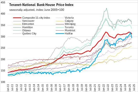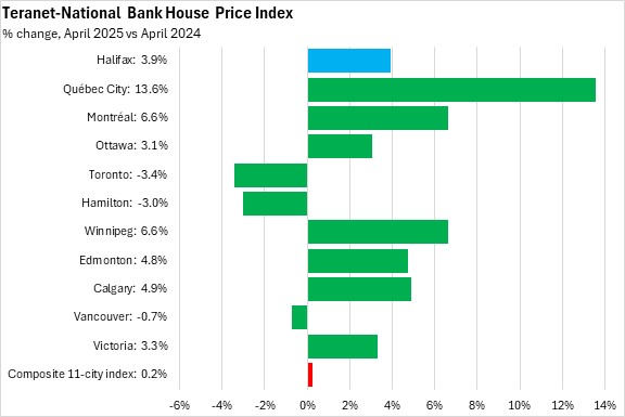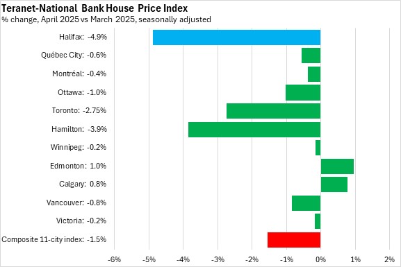 Halifax resale home prices, as measured by the Teranet-National Bank House Price Index (seasonally adjusted), fell 4.9% from March to April, the fastest decline among the 11 cities included in the index.