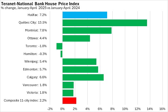 Halifax home prices were up 7.2% in the first four months of 2025 when compared with the same period in 2024. This was above the 11-city index average growth in resale home prices of 2.2%. Every city in the index except Toronto and Hamilton reported gains in home prices, with Québec City reporting the largest increase.